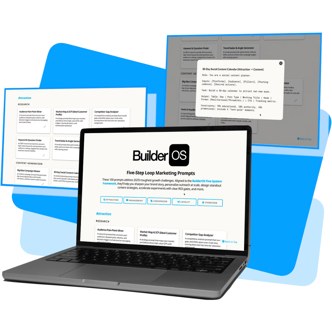 The BuilderOS Loop Marketing Prompts is your R&D lab in a box—designed to take you from random tactics to a repeatable growth system.